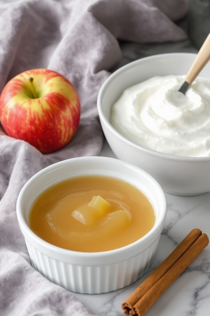 In a small bowl, combine ½ cup unsweetened applesauce, ½ cup plain yogurt, and a dash of cinnamon. Stir until smooth.
