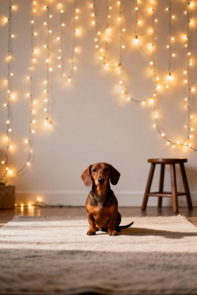 Hang a string of LED lights on a plain wall. Seat your dog several feet in front so the lights blur into that creamy bokeh. Pet‑photo educator That Tog Spot walks through lens choices, shutter speeds, and spacing (1/100–1/200 sec is a good starting point) (That Tog Spot). If you shoot on iPhone, Portrait mode still does the job.