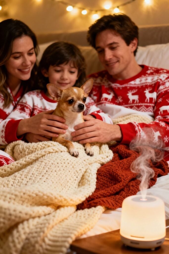 Match your PJs, pile on the couch or bed, and set a tripod with a Bluetooth remote. Keep your dog in the middle. Roverand Chewy both stress prep and comfort—practice sit/stay and keep the vibe calm (Rover holiday greeting tips; Chewy holiday pet photo guide).