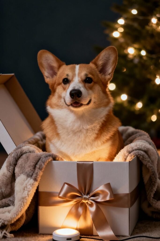 Line a gift box with a blanket, add a big ribbon around the box (not your dog), and keep the top open. Drop a treat inside so your pup peeks down. Pet‑photo educator Inspawration even suggests adding a cool, battery video light in the box for glow (Inspawration tutorial).