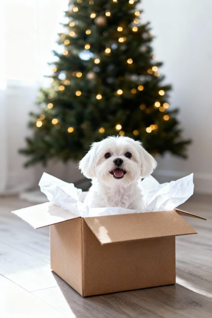 Photo Idea: Close‑up of dog pressing nose into a wrapped gift (no edible gifts on floor).