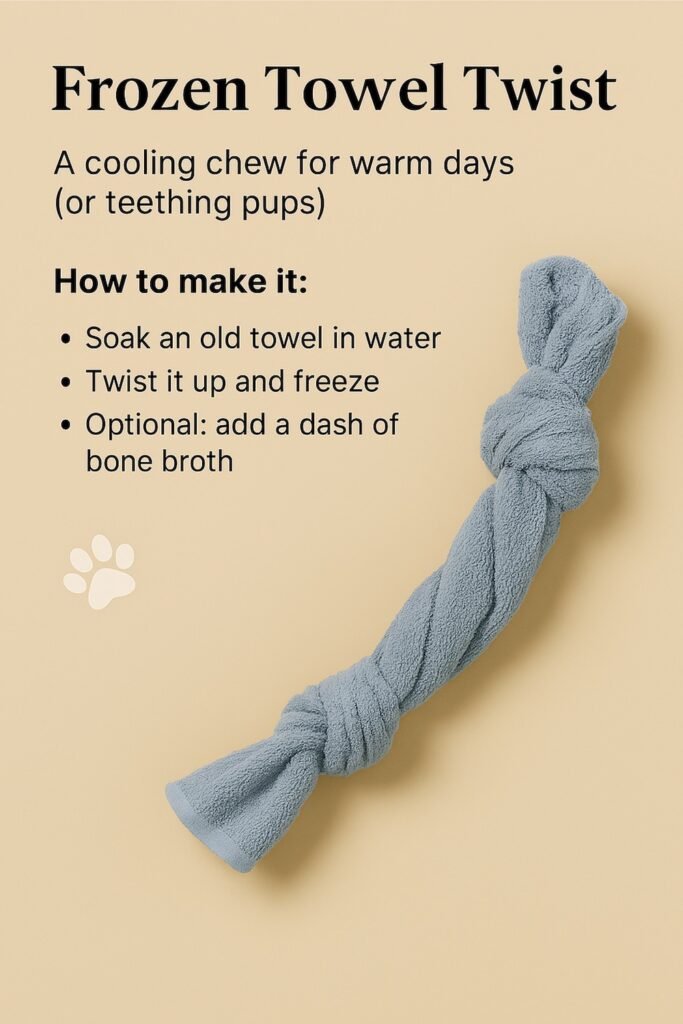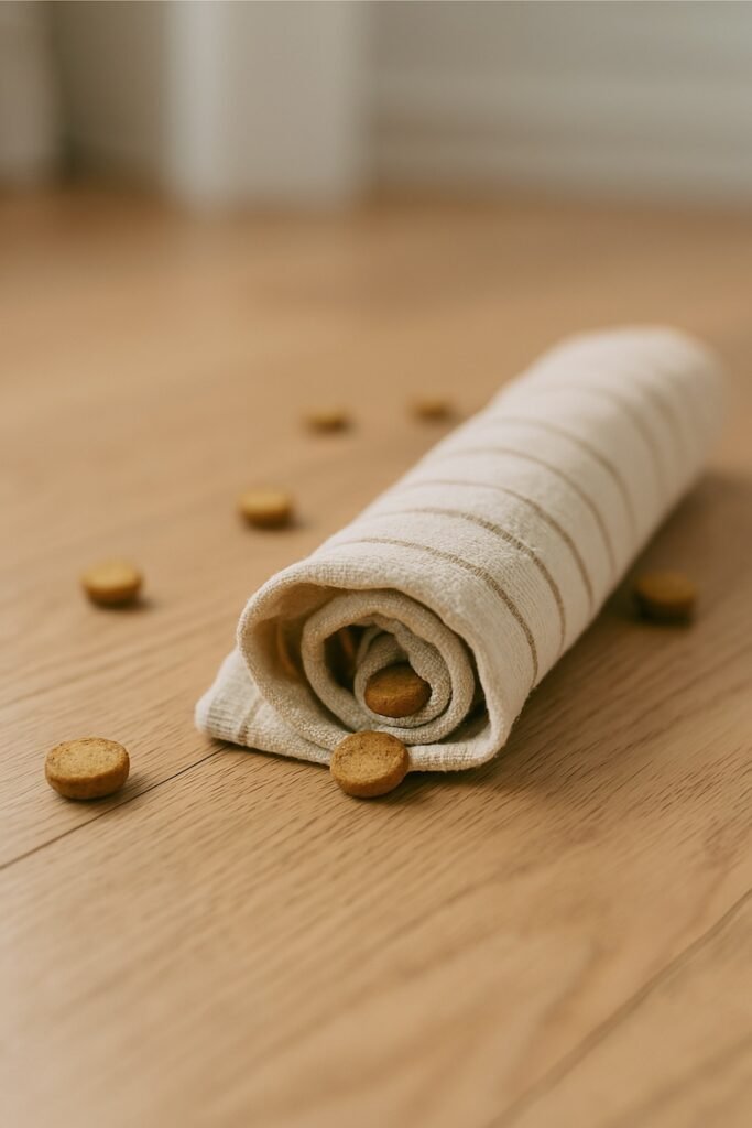 Old t-shirts, socks, towels, toilet rolls, fleece fabric, and cardboard boxes are paw-some starting points. Avoid anything with toxic dyes, sharp edges, or small parts your pup could swallow. When in doubt, if it’s safe enough to tug and chew under supervision, you’re good to go!