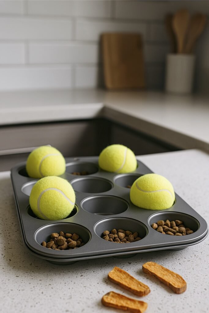 What You’ll Need: Muffin tin, tennis balls, kibble/treats