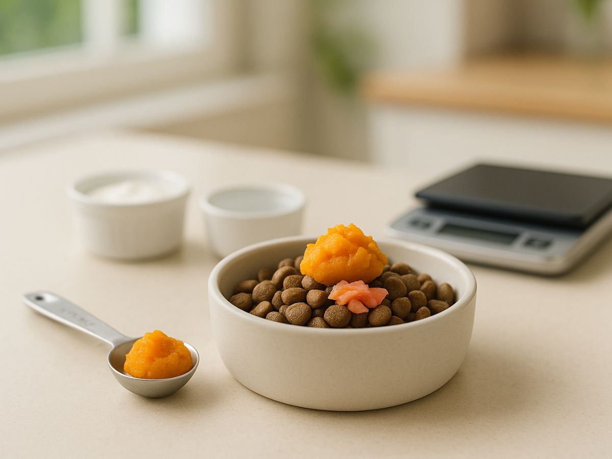 - Canned plain pumpkin: 1–2 tsp; can help stool quality (too much may constipate).